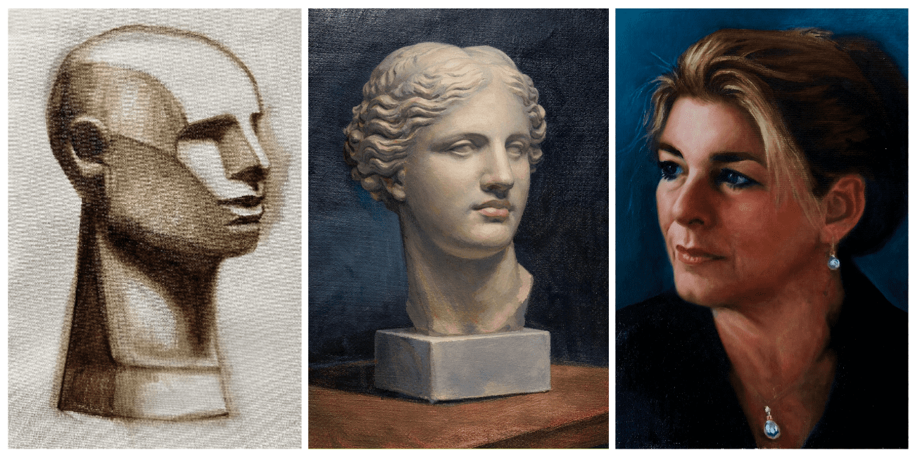 Central to the course is careful observation of planes of light, shadow and form, using plaster casts as a structured way to train the eye and strengthen technical understanding.